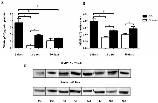 Nitric oxide (NO) production is usually used to denote M1 macrophages, a certain quantity of NO to perform their functions, such as destroying invading pathogens, killing tumor cells and removing foreign materials. Conversely, M2 macrophages produce lower NO levels. Therefore, we evaluated if CS exposure could affect the synthesis of NO at different times. The nitrite levels were increased 5 days after CS but reduced 14 days later; after 30 days, no difference was observed compared to control (Figure 3A). In addition, the protein levels of matrix metalloproteinase-12 (MMP-12) leads to tissue degradation that has been suggested as M2 macrophages. MMP-12 was increased in the CS 5, 14 and 30 days of exposure when compared to the control (Figure 3B,C).