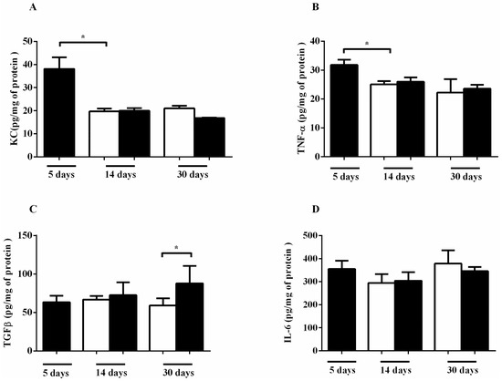 Effects of CS on cytokine production in the lung. The mice were exposed to 5, 14 and 30 days of CS (black bars) or ambient air (white bars) for 14 and 30 days and lung homogenates were isolated. The cytokines were measured by ELISA for (A) keratinocyte chemoattractant (KC), (B) interleukin-6 (IL-6), (C) tumor necrosis factor-α (TNF-α) and (D) transforming growth factor-β (TGF-β). Data represent the means ± SEM of 7–10 mice per group. * p < 0.05 compared to control. All statistical analyses were performed with a one-way ANOVA, followed by a Tukey’s post hoc test.