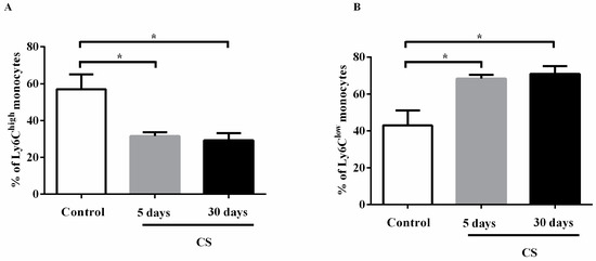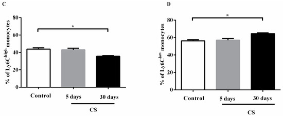 Based on the expression of Ly6C cell surface markers, we investigated the monocyte phenotype in blood and bone marrow of mice exposed to CS. The results revealed that CS exposure decreased the number of Ly6Chigh cells in blood after 5 and 30 days of exposure (Figure 6A) and consequently increased the number of Ly6Clow cells (Figure 6B). Moreover, CS can change the monocyte phenotype in bone marrow, with an increase in Ly6Clow cells, but only in the CS 30 days group (Figure 6C,D). These results showed for the first time that CS can change not only macrophage polarization but also monocyte phenotype in blood and bone marrow.