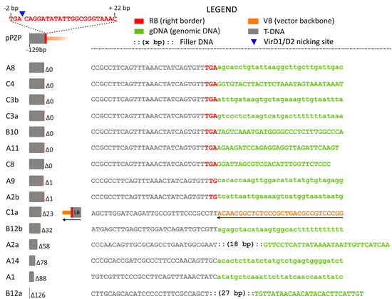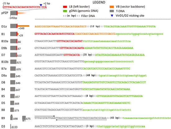 - Windels, P.; de Buck, S.; van Bockstaele, E.; de Loose, M.; Depicker, A. T-DNA integration in Arabidopsis chromosomes. Presence and origin of filler DNA sequences. Plant Physiol. 2003, 133, 2061–2068. [Google Scholar] [CrossRef] [PubMed]