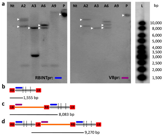 - De Buck, S.; De Wilde, C.; Van Montagu, M.; Depicker, A. T-DNA vector backbone sequences are frequently integrated into the genome of transgenic plants obtained by Agrobacterium-mediated transformation. Mol. Breed. 2000, 6, 459–468. [Google Scholar] [CrossRef]