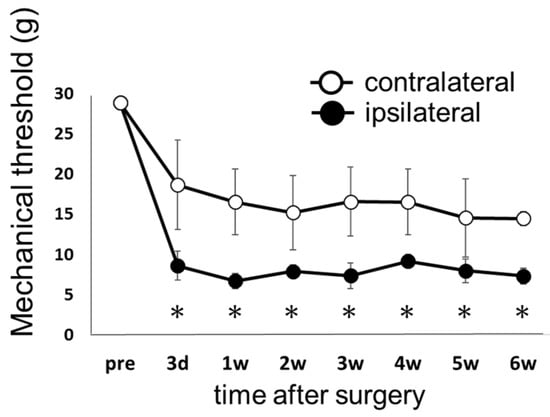 To evaluate mechanical sensitivity of the foot, as determined by foot withdrawal threshold in response to mechanical stimuli, we performed the von Frey test using Semmes Weinstein Monofilaments (A835-14-18, SAKAI Medical, Tokyo, Japan). The rats were placed on a metal mesh floor, and von Frey filaments were applied from underneath the metal mesh floor to the foot. To determine the withdrawal threshold, the stimulus strength was sequentially increased and decreased by up-down method. When the rats felt pain and withdrew their paw, the withdrawal threshold was measured by applying forces 5.5, 8.65, 11.7, 15, and 29 g. Paw sensitivity threshold was defined as the minimum pressure at which immediate withdrawal reflex of the paw was observed more than three times in a row. The measurements were performed before surgery and weekly for 6 weeks after surgery (1, 2, 3, 4, 5, and 6 weeks). Thermal sensibility was assessed by using the Hargreaves’ plantar test apparatus (Ugo Basile, Varese, Italy) as previously described [,]. In brief, rats were placed on a 2 mm thick glass floor 30 min before the experiment for habituation. A heat generator with an aperture of 10 mm diameter was focused onto the hind paw plantar surface pointing at both the lateral and the medial paw test sites. Thermal withdrawal latency was taken as mean of three measurements per each hind paw, with 5 min interval between each measurement. The withdrawal latencies were recorded in seconds of each paw.