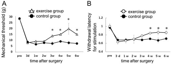 In the behavior test, the pain threshold decreased 3 days after surgery in both the exercise and the control groups. In the exercise group, pain-like behavior improved starting 3 weeks after surgery. From 3 to 6 weeks after surgery, the pain thresholds were significantly higher (p < 0.05) in the exercise group than in the control group.