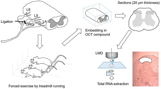 Schematic illustration of experimental procedures. L5 spinal nerve was ligated unilaterally (on the right side) distal to the L5 dorsal root ganglion (DRG). SNL rats were subjected to forced exercise on a treadmill as a model of exercise therapy. Spinal cord was resected at the T11 level and embedded in OTC compound, and then 20-μm frozen sections were produced. The tissue from laminae I–II of the dorsal horn was collected using a laser microdissection method, and the samples were used for extraction of total RNA.
