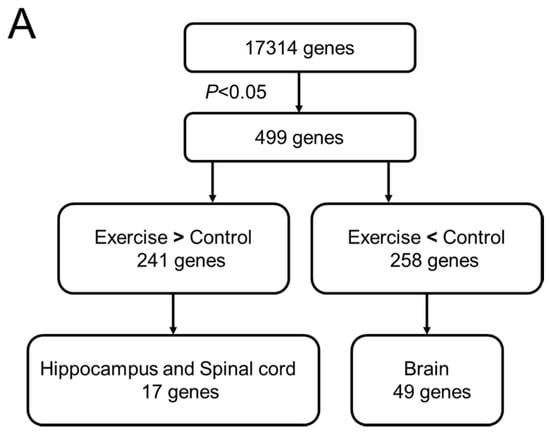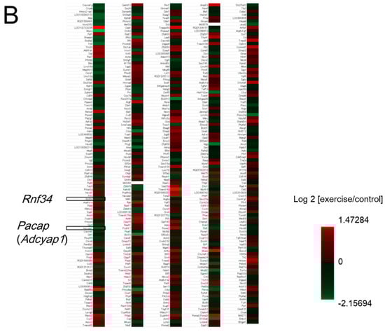(A) Analytical flowchart of gene-expression analyses by RNA-seq, bioinformatics, and quantitative PCR. RNA samples isolated from dissected tissue from the exercise and control (non-exercise) groups 6 weeks after surgery were subjected to RNA-seq. In total, 17,314 genes were initially identified. Those genes were sorted by relative expression level (exercise vs. control). In the exercise group, 241 genes were up-regulated and 258 genes were down-regulated with statistical significance (p < 0.05 according to Student’s t-test). Those genes were annotated based on the tissue specificity of their expression; (B) Heat map of the gene expression profile obtained from the result of RNA-seq. Total of 499 genes (241 upregulated genes and 258 downregulated genes) were identified with statistical significance. Rnf34 and Pacap (Adcyap1) were selected from the list of downregulated genes by tissue specific functional annotation. The fold change values (log 2 (exercise/control)) of Rnf34 and Pacap were −0.72 and −1.01, respectively. Clearer picture can be found in the supplementary figure.