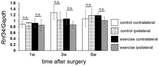 To confirm the laterality of Rnf34 expression level, we separately analyzed the ipsilateral and contralateral sides of laminae I–II, as shown in Figure 6. At 3 weeks after surgery, expression of Rnf34 was lower on the ipsilateral side than on the contralateral side. A similar tendency was also detectable at 1 and 6 weeks after surgery, but the differences were not significant.