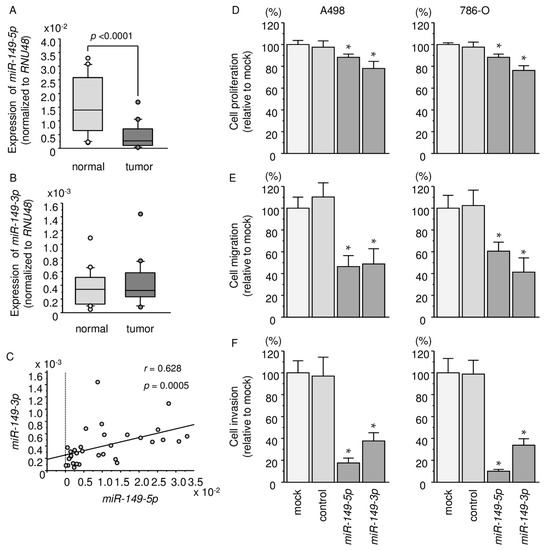 Analysis of miR-149-5p and miR-149-3p expression in clinical specimens and functional assays in renal cell carcinoma (RCC) cell lines (A498 and 786-O cells) following miR-149-5p and miR-149-3p transfection. (A,B) Expression levels of miR-149-5p and miR-149-3p in RCC clinical specimens were determined by qRT-PCR. Data were normalized to RNU48 expression; (C) Correlation between the relative expression levels of miR-149-5p and miR-149-3p; (D) Cell proliferation was determined by XTT assays. * p < 0.0001; (E) Cell migration activity was determined by wound-healing assays. * p < 0.0001; (F) Cell invasion activity was determined using Matrigel invasion assays. * p < 0.0001.
