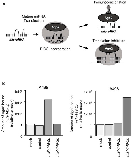 After transfection with miR-149-5p and immunoprecipitation with anti-Ago2 antibodies, miR-149-5p levels were significantly higher than those of mock- or miR control-transfected cells and those of miR-149-3p-transfected A498 cells (p < 0.0001; Figure 2B). Similarly, after transfection with miR-149-3p and immunoprecipitation with anti-Ago2 antibodies, miR-149-3p levels were significantly higher than those of mock- or miR control-transfected cells and those of miR-149-5p-transfected A498 cells (p < 0.0001; Figure 2B).