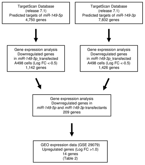 The strategy underlying the analysis of miR-149-5p and miR-149-3p target genes in A498 cells. FC: fold-change.
