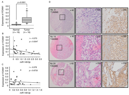 Expression levels of FOXM1 in ccRCC clinical specimens and TCGA data analysis based on FOXM1 expression in ccRCC. (A) Expression levels of FOXM1 in ccRCC specimens were significantly upregulated in cancer tissues compared with normal tissues (p < 0.0001); (B,C) The correlation between FOXM1 and miR-149-5p, and FOXM1 and miR-149-3p and (D) FOXM1 protein was strongly expressed in several cancer tissues, while low expression was observed in normal tissues using a tissue microarray.