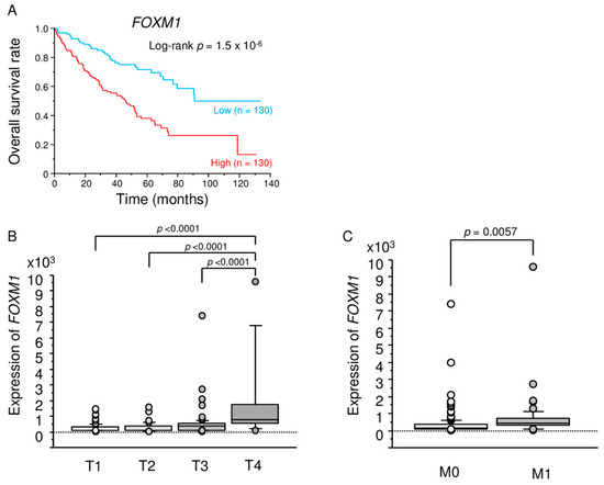 We analysed Kaplan-Meier overall survival (OS) curves according to the expression levels of dual strands of pre-miR-149 and FOXM1 and the relationships between FOXM1 expression and tumor stage and metastasis in ccRCC using the TCGA-KIRC database. The TCGA dataset showed that high expression of miR-149-5p was associated with a poor prognosis of the patients with RCC. The miR-149-3p data was not available in this database (data not shown). The Kaplan–Meier curves for OS rates showed that the group with high expression of FOXM1 had a significantly shorter survival than the low expression group in ccRCC (p = 1.5 × 10−6, Figure 5A). The expression levels of FOXM1 were significantly increased in advanced T stage cases and metastatic cases (Figure 5B,C).