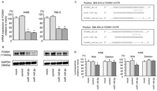 Both strands of pre-miR-149, miR-149-5p (guide strand) and miR-149-3p (passenger strand), acted as antitumor miRNAs in RCC cells. FOXM1 was regulated by these miRNAs, and an overexpression of FOXM1 was observed in RCC clinical specimens. The aberrant expression of FOXM1 enhanced cancer cell aggressiveness, and high expression of FOXM1 was significantly associated with a poor prognosis of this disease. The identification of antitumor-mediated oncogenic networks may lead to a better understanding of RCC pathogenesis.
