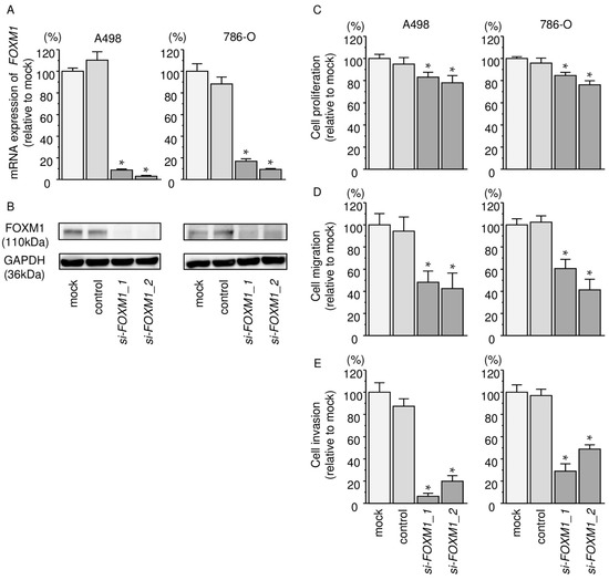 We evaluated the knockdown efficiency of si-FOXM1 transfection in RCC cells. Our present data showed that si-FOXM1 transfection effectively downregulated FOXM1 expression in A498 and 786-O cells (Figure 7A,B). Functional assays demonstrated that cell proliferation, migration, and invasion were all inhibited in si-FOXM1 transfectants compared with mock- or miR control-transfected cells (p < 0.0001, Figure 7C–E).