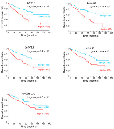 To investigate the contribution of miR-149-5p and miR-149-3p to the coordinate regulation of genes (Table 2) in ccRCC pathogenesis, we searched the TCGA database. Among 14 genes, the expression of 6 genes (FOXM1, SIPA1, CXCL5, LMNB2, GBP2, and APOBEC3C) was significantly associated with a poor prognosis of patients with ccRCC (Figure 8).