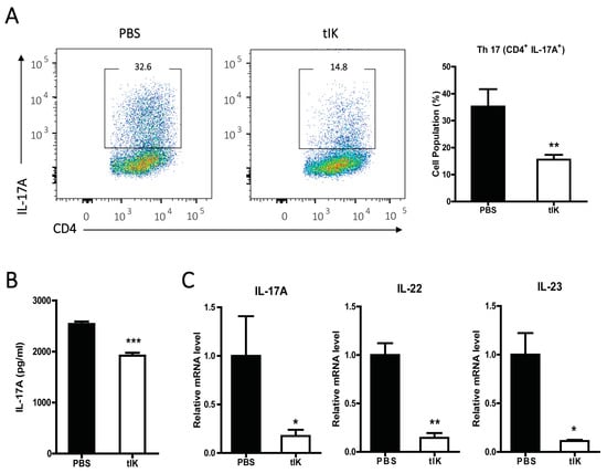To investigate the effect of tIK protein on Th17 cell differentiation, we treated naive CD4+ T cells isolated from the spleens of WT mice with exogenous tIK protein under Th17-polarizing conditions. We observed cell clumps in the Th17-polarizing conditions but not in the normal culture medium (Figure S2). We analyzed the resulting cells using flow cytometry after intracellular staining to measure the Th17 cell population. Compared with cells treated with phosphate-buffered saline (PBS) in Th17-polarizing medium, the tIK protein-treated cells showed reduced Th17 cell differentiation (Figure 2A). Moreover, the level of IL-17A secreted from Th17 cells after they were stimulated with anti-CD3 and anti-CD28 antibodies for 24 h was lower in tIK protein-treated cells than in controls (Figure 2B). The levels of mRNA for IL-17A and other cytokines associated with Th17 cells including IL-17A, IL-22, and IL-23, as measured by qPCR, were also lower in tIK protein-treated cells than in PBS-treated cells (Figure 2C).