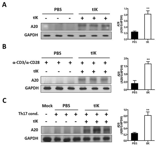 A previous report showed that CD4+ splenic T cells from tIK-Tg mice expressed A20, a negative regulator of NFκB, under Th17-polarizing conditions []. In this study, we investigated the effect of exogenous tIK protein on the induction of A20 in stimulated and unstimulated T cells. The results shown in Figure 4A indicate that tIK protein treatment of T cells isolated from spleens of WT mice induced a time-dependent expression of A20; the highest expression of A20 was at 8 h post-treatment and A20 expression continued until 48 h post-treatment (Figure S3A). Moreover, tIK protein could induce A20 expression under both T cell-activating and Th17-polarizing conditions (Figure 4B,C) and A20 expression was also induced in isolated naive CD4+ T cells under T cell activating conditions (Figure S3B).