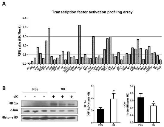 Treatment with tIK protein affects the activation of various transcription factors. (A) Nuclear extracts from CD4+ T cell treated with PBS or tIK protein for 8 h were used as samples for a plate array and the activation level of several transcription factors was compared between the PBS-treated group and the tIK protein-treated group. The RFU indicates the ratio of values for transcription factors in tIK-treated and control (PBS-treated) cells; (B) The expression level of HIF-1α and c-Jun (AP-1 component) were confirmed by Western blotting. Nuclear extract was prepared as described for Figure 5A and used for confirmation. Data is represented as the mean ± SD (n = 3), * p < 0.05.