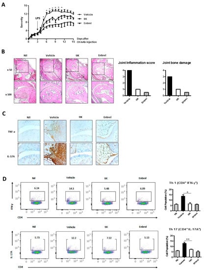 The damage to tarsal bones and the infiltration of immune cells to the joint tissue were also analyzed. Compared with control mice, tIK-injected mice showed milder bone damage and immune cell infiltration similar to that seen in Enbrel-injected mice at 10 days after CAIA induction (Figure 6B). The scores for inflammation and bone damage in tIK- and Enbrel-injected mouse joints, calculated using a previously reported scoring protocol [], were lower than those in the vehicle group (Figure 6B). Even though technical problems meant that not all slides covered the same area of the mouse joint, the levels of inflammatory cytokines (TNF-α and IL-17A) expressed in the joint tissue were lower in tIK-injected mice and Enbrel-injected mice than in control mice (Figure 6C). However, although the overall expression pattern of proinflammatory cytokines and bone damage in the mouse joints was clearly identified, the statistical significance of differences could not be calculated because of the limitation in slide numbers. Moreover, at 10 days after induction, the numbers of IFN-γ-producing CD4+ T cells (Th1) and IL-17-producing CD4+ T cells (Th17) in tIK-treated mice were clearly reduced compared with control mice, and were similar to those in Enbrel-injected mice (Figure 6D). This flow cytometry data was obtained in the following order: after FSC/SSC and singlet gating, the cell population was finally gated by CD4+/IFN-γ or CD4+/IL-17A+. They were not adjusted by cell viability. Thus, the effect of dead cells was not ruled out. However, these results of the reduction of Th1 and Th17 by tIK protein were clearly in accordance with previous results []. Therefore, these observations suggest that exogenous tIK protein may have a suppressive effect on the induction of Th1 and Th17 cells and the inflammatory symptoms of arthritis.