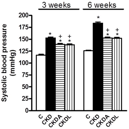 | Blood urea nitrogen (mg/dL) | 4.16 ± 0.40 | 63.16 ± 10.96 * | 42.18 ± 6.21 *,+ | 38.66 ± 3.77 *,+ |