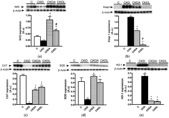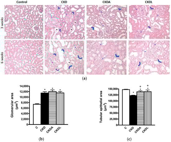 | Serum creatinine (mg/dL) | 0.42 ± 0.02 | 1.43 ± 0.17 * | 1.122 ± 0.10 *,+ | 0.825 ± 0.28 *,+,# |