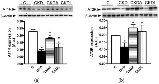 - Wang, Z.Q.; Millett, L.J.; Heiderstadt, N.T.; Siragy, H.M.; Johns, R.A.; Carey, R.M. Differential regulation of renal angiotensin subtype AT1A and AT2 receptor protein in rats with angiotensin-dependent hypertension. Hypertension 1999, 33, 96–101. [Google Scholar] [CrossRef] [PubMed]