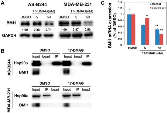 We previously demonstrated that 17-DMAG could inhibit the expression of ALDH+ in AS-B244 human breast cancer cells [22]. We enriched BCSCs through mammosphere cultivation to further examine the effect of 17-DMAG on the self-renewal of BCSCs [10]. As shown in Figure 1, 17-DMAG inhibited the mammosphere formation of AS-B244 and MDA-MB-231 TNBC cells in a dose-dependent manner. This finding suggested that 17-DMAG suppresses the proliferation of TNBC CSCs under non-adherent and serum-free cultivation conditions. Several studies have reported that BMI1 positively regulates the self-renewal capability and tumorigenicity of BCSCs [23,24,25,26]. We next examined the effect of 17-DMAG on BMI1 expression in AS-B244 or MDA-MB-231 mammosphere cells. Our Western blot data indicated that 17-DMAG inhibited BMI1 expression in AS-B244 and MDA-MB-231 mammosphere cells (Figure 2A). Then, we used the immunoprecipitation method to determine if BMI1 is a client protein of Hsp90α. We found that the BMI1 protein is not co-precipitated by the anti-Hsp90α antibody (Figure 2B). Through quantitative RT-PCR, we observed that BMI1 mRNA expression in AS-B244 and MDA-MB-231 mammosphere cells are downregulated by 17-DMAG treatment in a dose-dependent manner (Figure 2C). These results indicated that 17-DMAG suppresses BMI1 expression through a transcriptional regulatory mechanism.