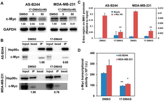 c-Myc is a transcriptional factor that controls BMI1 expression [27]. Western blot results indicated that 17-DMAG inhibits c-Myc expression in a dose-dependent manner (Figure 3A). The physical interaction between c-Myc and Hsp90 in Ras-overexpressed MCF7 breast cancer cells [28]. Subsequently, we examined the effect of 17-DMAG on the interaction between Hsp90α and c-Myc and found that 17-DMAG decreases the binding of Hsp90α and c-Myc in AS-B244 and MDA-MB-231 mammosphere cells (Figure 3B). Using chromatin immunoprecipitation (ChIP) analysis, we found that 17-DMAG treatment inhibits the binding of c-Myc on the E-box region in the BMI1 promoter (Figure 3C). Furthermore, the results of a luciferase-based reporter assay demonstrated that 17-DMAG downregulates the transcriptional activity of c-Myc in AS-B244 and MDA-MB-231 mammosphere cells (Figure 3D). These results indicated that the loss of c-Myc protein due to 17-DMAG mediated inhibition of Hsp90α resulted in decreased transcription of c-Myc target genes, including BMI1 in BCSCs.