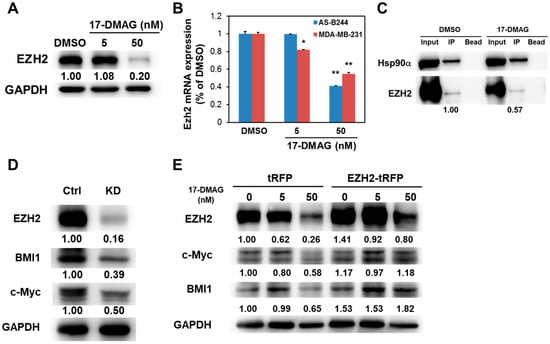 EZH2 expression in MDA-MB-231 mammospheres was suppressed by 17-DMAG. (A,B) The protein (A) or mRNA (B) expression of EZH2 in MDA-MB-231 mammospheres after 17-DMAG treatment (5 or 50 nM) was determined at 96 h (A) or 48 h (B). * p < 0.05; ** p < 0.01. (C) The interaction between EZH2 and Hsp90α in mammospheres of MDA-MB-231 after 17-DMAG treatment (50 nM) was determined by immunoprecipitation with anti-Hsp90α antibody; (D) Knockdown of EZH2 in primary mammosphere from MDA-MB-231 cells was performed by lentiviral delivery of LacZ- (Ctrl) or EZH2- (KD) specific shRNAs and total proteins were extracted for determination of EZH2, BMI1 or c-Myc expression by Western blot; (E) Overexpression of EZH2 was performed by lentiviral delivery of tRFP or EZH2 gene into MDA-MB-231 cells and selected by 20 µg/mL BSD for five days. Successfully-transduced cells were then cultured into mammosphere, treated with 0.1% DMSO or 17-DMAG (5 or 50 nM) for 96 h, and extracted the total proteins for determination of BMI1, c-Myc, EZH2, or GAPDH expression by Western blot. Inserted numbers indicated relative protein expression levels in comparison with the control.