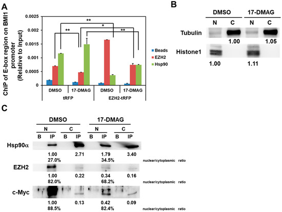 We investigated the possibility of the formation of the Hsp90α/c-Myc complex within the BMI1 promoter. Using anti-Hsp90α or anti-EZH2 antibody to perform ChIP analysis, we amplified the c-Myc binding region within the BMI1 promoter through qRT-PCR. The results indicated that Hsp90α or EZH2 complexes with c-Myc to bind with the BMI1 promoter (Figure 5A, DMSO group of tRFP overexpressed cells). Treatment with 17-DMAG decreases the binding of EZH2/c-Myc complex on the BMI1 promoter, whereas the overexpression of EZH2 can overcome the inhibitory effect of 17-DMAG (Figure 5A). Given that Hsp90α participates in the nuclear–cytoplasmic shuttling of the mineralocorticoid receptor [31], we then investigated the effect of 17-DMAG on the Hsp90α-mediated nuclear–cytoplasmic shuttling of EZH2 or c-Myc. We isolated nuclear and cytosolic proteins and used equal amounts of nuclear and cytoplasmic proteins for immunoprecipitation (Figure 5B). When anti-Hsp90α antibody was used to perform immunoprecipitation, the Hsp90α/c-Myc/EZH2 complex localized in the nucleus (Figure 5C, DMSO group). By calculating the nuclear/cytoplasmic ratio of Hsp90α-shuttled EZH2- or c-Myc, we found that only EZH2 content decreased from 82.0% to 68.2% in response to 17-DMAG treatment (Figure 5C. However, 17-DMAG treatment decreased the nuclear content of Hsp90α-shuttled EZH2 and c-Myc (Figure 5C, 17-DMAG group), but not the nuclear entrance of Hsp90α (Figure 5C). These results suggested that the inhibition of Hsp90α activity by 17-DMAG leads to the decrease of the nuclear translocation of EZH2 and c-Myc and causes the downregulation of BMI1 in BCSCs.