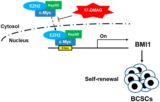 In the present study, we further investigated the molecular mechanism that underlies the BCSC-targeting effect of 17-DMAG and discovered that BMI1 is downregulated in 17-DMAG-treated TNBC-derived mammosphere cells. We also demonstrated that the downregulation of BMI1 by 17-DMAG is mediated by the suppression of c-Myc transcriptional activity and the downregulation of the enhancer of zeste homolog 2 (EZH2), a PRC2 member. The overexpression of EZH2 prevents the downregulation of BMI1 or c-Myc in 17-DMAG-treated BCSCs. Finally, we discovered that Hsp90α complexes with EZH2 and c-Myc on the BMI1 promoter and functions as a shuttle that translocates EZH2 and c-Myc to the nucleus. Our data suggested that Hsp90α could positively regulate the self-renewal of BCSCs by facilitating the nuclear translocation of c-Myc and EZH2 to maintain BMI1 expression.