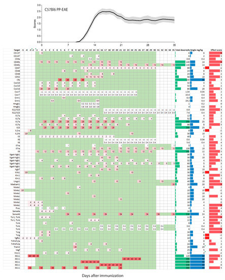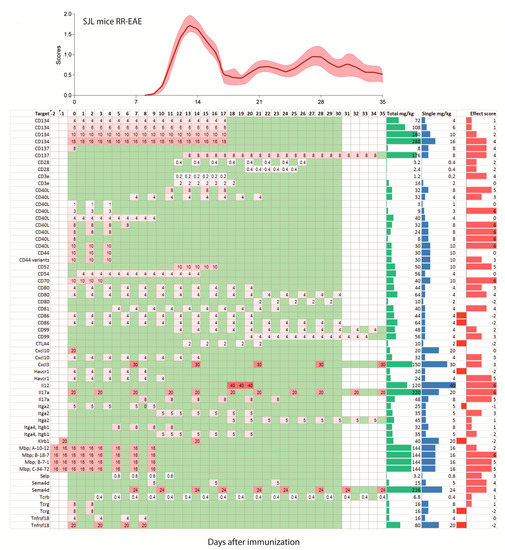 Treatment schedules with monoclonal antibodies in the C57BL6 mouse model of primary progressive experimental autoimmune encephalomyelitis (PP-EAE) after active immunization on day zero. The schedules are aligned with the mean time course ±95% confidence interval (red area) of the pooled clinical experimental autoimmune encephalomyelitis (EAE) scores of 92 mice of our own studies. Mice were untreated or receiving placebo. The left panel shows the targets, the right columns show the total dose in mg/kg (green), single dose (mg/kg, blue) and the effect size score (red), not weighted fro number of mice. The effect sizes range from 6 (very strong reduction of EAE scores) to 0 (no effect), and is negative (−1 or −2) where the antibody made the disease worse. The schedule ranges from −5 days up to 35 days and is color-coded. The darker the red, the higher was the single dose. Days without treatment are green, days without observation white. Observations > 35 days in 2 studies were cut.