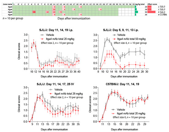To address the impact of treatment schedules relative to disease onset we assessed the effects of anti-Itga4 in four independent experiments (Figure 6), testing two routes of administration (intraperitoneal (i.p.) vs. intravenous (IV)), two strains (SJL/J, C57BL6) and two schedules (peak vs. pre-onset). In 2 experiments with SJL/J mice we observed a mild reduction of EAE scores, either with i.p. or IV injections, starting at the time of the first peak (Effect size 2, onset day 11). With the same i.p. schedule, anti-Itga4 had no effect in C57BL6 mice. However, anti-Itga4 considerably reduced EAE scores (effect size score 4) in another experiment in SJL/J mice, in which treatment was initiated before onset of the scores 5 days after immunization (preventive), hence supporting the idea that efficacy of anti-Itga4 depended on the day of treatment start relative to the onset of clinical scores.