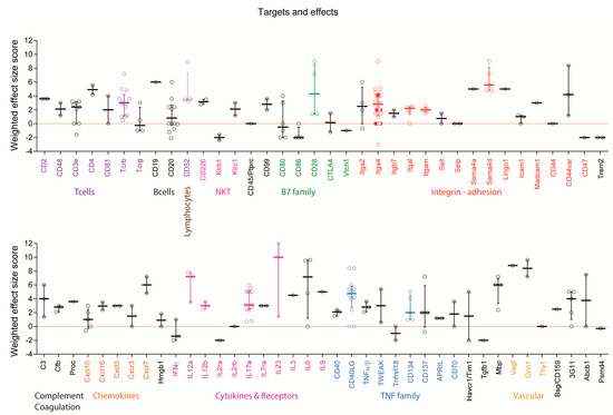 Monoclonal antibodies were directed against 78 different targets (Figure 7 and Figure 8) including cell surface markers of T cells, B cells, dendritic cells (DCs), microglia and macrophages, endothelial cells and NK cells and secreted factors including cytokines, chemokines, semaphorins and complement factors. Failures appeared to occur randomly in some experiments with several targets, which were tested in more than one study including anti-Itga4, which failed in 2 experiments [40,41]. The same antibody, PS/2, provided moderate to strong EAE reduction in other studies at similar doses [40,41,42,43,44] and aggravated symptoms in one study [40], the latter in an adoptive transfer experiment with late onset of therapy, where the mAb increased the relapse rate. Similarly, anti-CD40L failed twice [9,45], while the same antibody (MR-1) was moderately to strongly effective in other studies, all using SJL/J mice with the same preventive regimen and similar doses [7,8,9,11,46]. One failure with anti-CD40L was likely caused by a low dose, the other without obvious reason. Nevertheless, CD40L or its receptor appear to be promising targets. Other promising candidates with at least 4 positive experiments (effect size > 0, highlighted by color lettering in Figure 7) and no aggravations, include Sema4d [30,47], CD28 [48,49,50], CD52 [51,52,53], IL-12 [12,25,46,54], IL-17 [13,28,55,56,57,58] and some TNF family members [59]. Experiments showing strong efficacy of mAbs targeting Itgal/CD11a and Itgam/CD11b were obtained all in one study using 4-6 mice per group [60]. In addition, some mAbs were so far tested only once, such as anti Lingo1 [61], but might be promising candidates.