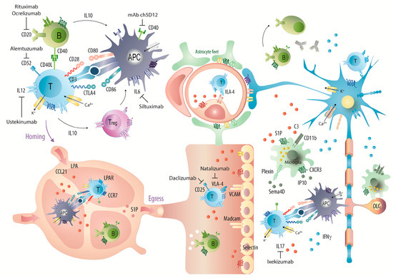 Graphical illustration of the majority of candidates, which were targeted with monoclonal antibodies in EAE studies and mechanisms of some approved mAbs or promising candidates. Abbreviations: APC, antigen presenting cells; CD, cluster of differentiation; CCR and CXCR, chemokine receptors; CCL21 and IP10, chemokines; IFN, interferon; IL, interleukin; LPA, lysophosphatidic acid; OLG, oligodendrocytes; S1P, sphingosine-1-phosphate; VLA-4, very late antigen 4; VCAM, vascular cell adhesion molecule. Mechanisms of currently approved disease modifying drugs in MS have been illustrated in [74].