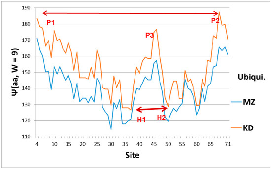 The broad features of the Ψ(aa,W) ubiquitin profiles with the first-order KD and second-order MZ scale are similar, as shown in Figure 1, which explains their orientation. The dominant feature of Ub is the two sets of level extrema, (P1,P2) and (H1,H2), which synchronize and accelerate tagging [6]. This figure also shows that a key role in ubiquitin is played by the central hydrophobic peak P3, which functions mechanically as an elastic pivot, separating two hydrophilic hinges. The significance of the hydrophobic peak is also clear in a hydrodynamic model, where peptide chain segment Cα center motion is described by vectors describing particle flow. A general theorem of vector fields decomposes them into solenoidal and irrotational components. The solenoidal components are connected to vortex centers, and here the hydrophobic peak is such a center. Its relative strength is larger using the first-order KD scale. Another way of explaining the dominance of the KD fluctuations is that the function of Ub is intrinsically first-order (the diseased protein is tagged once, and then destroyed by the ubiquitinase cascade [1]).