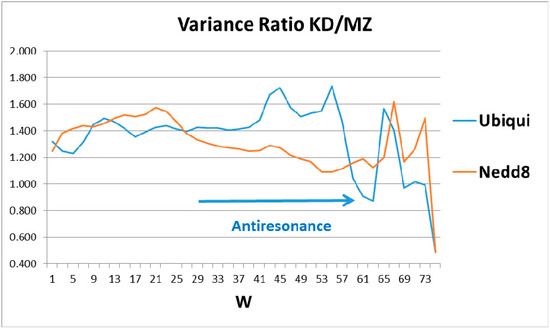 The human globular roughness, as a function of sliding window length, W, shows a rich structure for ubiquitin, but only weak structure for Nedd8. Here the structure above W 67 could be noise, but the two peaks centered on W = 45 and 55, and the sharp dip at 61–63, are genuine. Since ubiquitin is perfect, we expect that its second-order fine structure, monitored by the MZ variance, has become smooth (small variance), and that it is this MZ smoothness being small (or the KD roughness being large) that produces the two peaks in KD/MZ. Similarly, the 61–63 anti-resonance should be caused by a rough spot in MZ which evolution has not removed. This could be the two N- and C-wings of the overall profile (Figure 1) which are critical to its tagging opposing sides of target cracks.