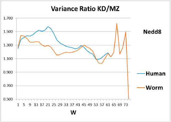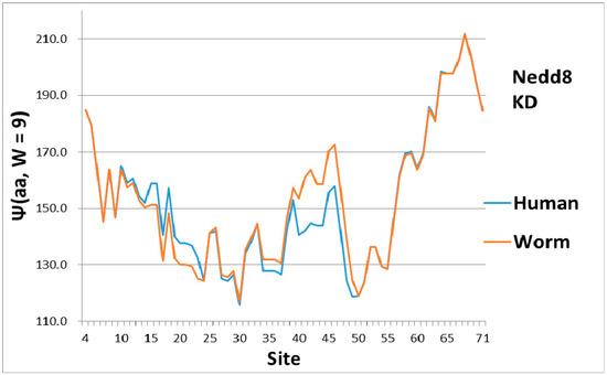 As a check, there must be some indication of how the magical structure of ubiquitin has evolved, hidden in Nedd8 properties. There is, because although ubiquitin is perfect and has not evolved, its look-alike Nedd8 has. It turns out that the largest worm-human evolutionary changes in the Ψ(aa,W = 9) Nedd8 profiles occur in the first-order KD profile, which is shown in Figure 3. The variance profiles of human and worm Nedd8 are compared in Figure 4 and discussed there. The main point is that the nearly equal N and C terminal pivot hydrophobicities in Ub is absent in Nedd8.