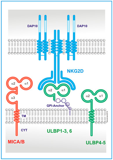 Protein structures of Natural Killer Group 2D (NKG2D) and its ligands. NKG2D is a disulfide-linked homodimer, transmembrane protein that can bind to two adapter molecules, DAP10 (DNAX-activating protein of 10 kDa), also a homodimer. NKG2D ligands are eight different MHC I-like molecules. Four of these (MHC class I polypeptide-related sequence (MIC) A/B and UL16 binding protein (ULBP) 4/5) are bound to the cell membrane by transmembrane (TM) domains with a cytoplasmic tail (CYT), while the other four (ULBP1-3 and 6) are glycophosphatidylinositol (GPI)-anchored. Each has two or three α domains.