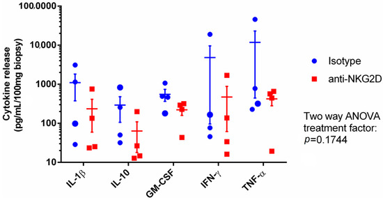 Inflamed intestinal mucosal biopsies from four CD patients treated in an explant assay over 24 h with either isotype control or anti-NKG2D antibody. The release of five cytokines to the medium was analyzed and quantified as pg/mL normalized to 100 mg of tissue. The average of measurements from four biopsies are represented in each data point, shown as the mean ± SEM, with two-way ANOVA.