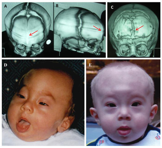 Computed tomography (CT) scan of the cranium with helical and 3D reconstruction. (A,B) One month old: skull morphology appears triangular; the metopic suture is already calcified in its middle-lower portion (red arrows), and gives the skull a trigonocephalic aspect; (C) Eleven months old: results of bilateral frontal bone craniotomy with removal of the median hyperostotic ridge (red arrow); (D) Patient one month old, showing a high forehead, a prominent metopic suture, bitemporal narrowing, up-slanting palpebral fissures, and anteverted nares; (E) Patient eight months old, after the craniotomy, has a wider bitemporal space and less pronounced up-slanting palpebral fissures.