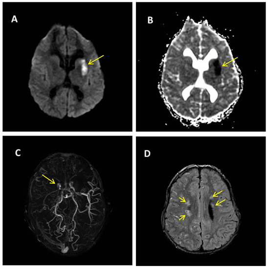 Brain magnetic resonance imaging (MRI) at the age of 10 years, after the first TI sequence. (A,B) Diffusion weighted imaging (A) and diffusion coefficient map (B) show a lesion of the left lenticular nucleus of the anterior part of the internal capsula, and the head and body of the lateral nucleus caudatus characterised by reduced diffusion due to an acute ischemic lesion (yellow arrows). (C) Angio-TOF MRI showing the stenosis of the right carotid siphon apex (yellow arrow) associated with poorly visualised flow of the ipsilateral middle cerebral artery, stenosis of the left carotid siphon apex, and a stretch of the M1 ipsilateral middle cerebral artery; (D) Fluid attenuation inversion recovery (FLAIR) sequence: small areas of signal hyperintensity at the semioval centres bilaterally (yellow arrows), most marked on the right side.