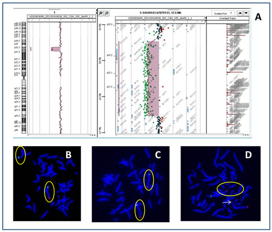 (A) Partial result of an array-comparative genomic hybridisation (a-CGH) in the patient showing on the left the general profile of chromosome 1, and on the right the deleted 1p32p31 region. The genes included in the deleted region are: PPAP2B; PRKAA2; C1orf168; C8A; C8B; DAB1; MIR548D2; OMA1; TACSTD2; MYSM1; JUN; LOC729467; FGGY; HOOK1; CYP2J2; C1orf87; NFIA; TM2D1; INADL; L1TD1; KANK4; USP1; DOCK7; ANGPTL3; ATG4C; FOXD3; ALG6; ITGB3BP; EFCAB7; DLEU2L; PGM1 ROR1 UBE2U, and; CACHD1; (B,C) Results of Fluorescence in Situ Hybridization (FISH) experiments conducted on metaphases obtained from lymphocytes cultures of peripheral blood of the mother (B), the father (C) and the patient (D), showing normal red (specific probe for the subtelomeric 1q region) and green (specific probe for the 1p32 region) signals in the parents (target chromosomes encircled by yellow ovals), indicating the absence of the deletion of 1p32 (B,C), that instead is present in the patient (D), where the green signal is absent on the chromosome 1p32, indicated by the white arrow, the normal chromosome is also encircled by a yellow oval.