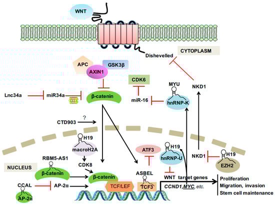 - Ma, Y.; Yang, Y.; Wang, F.; Moyer, M.P.; Wei, Q.; Zhang, P.; Yang, Z.; Liu, W.; Zhang, H.; Chen, N.; et al. Long non-coding RNA CCAL regulates colorectal cancer progression by activating Wnt/β-catenin signaling pathway via suppression of activator protein 2α. Gut 2016, 65, 1494–1504. [Google Scholar] [CrossRef] [PubMed]