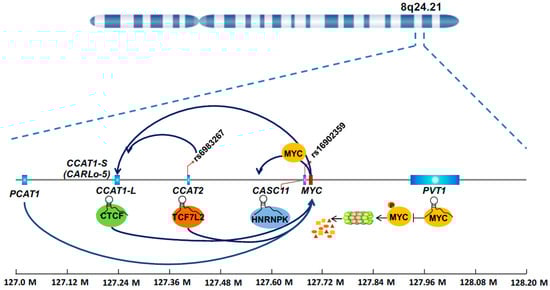 The chromosome 8q24 is frequently amplified in human cancer. Particularly, the 8q24.21 genomic region that spans almost 2 Mb but represents a desert for protein coding genes and attracts much attention for several reasons. (i) This region contains the MYC gene, which is a classical Wnt signaling target and an essential oncogene [27,39]. (ii) Genome-wide association studies consistently suggested that multiple single nucleotide polymorphisms (SNPs) in such region are associated with CRC risk [40,41,42]. (iii) DNA elements in this region have various enhancer activities that are affected by SNPs [43,44], and more recently this region was proposed as a typical example of a super-enhancer [45]. These observations, originating from a different angle but pointing to the same genomic locus, indicate that important unidentified molecular culprits reside in such region. Indeed, the last decade witnessed an explosion of discoveries of lncRNAs in the 8q24.21 region, most of which show relevance with multiple types of cancers including CRC. Not surprisingly, a large proportion of these lncRNAs were found to regulate MYC, a protein-coding gene in the region, in one way or another (Figure 2). We can envision that strong enhancer activity in this region promotes transcription of lncRNAs because of the presence of abundant transcriptional factors and mediator proteins. These lncRNAs in turn increase the enhancer activity by forming the chromatin loop or bridging the protein partners, thus creating a positive feedback mechanism in controlling MYC expression. Because of their sensitivity in responding to oncogenic signals, the lncRNAs themselves are often found to be prognosis factors in predicting the outcome of CRC patients.