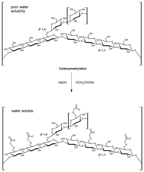β-Glucans are non-cellulosic polymers of β-d-glucose belonging to a group of biologically active biopolymers which exist in different structural organizations [1,2,3,4], i.e. linear with glycosidic bonds in the β(1→3) position (i.e., curdlan) or branch-on-branch or cyclic structures (1→3,1→6)-β-glucans. They are widespread in nature such as in fungi, cereals, bacteria or seaweeds [5,6,7,8]. The unique properties of β-glucans have led to several applications including the formulation of food gels or application as helical scaffolds for nanostructure formation [1,2]. The reason why so much attention has been devoted to β-glucans is that they are a typical example of biological response modifiers with pronounced immunomodulating activity which confer them anticancer, antioxidant, antiviral and wound healing properties [9,10]. These biopolymers are also widely employed as nano-carriers for the delivery of active compounds (e.g., hydrophobic drugs which show low bioavailability in the human tissues) [11,12]. However, due to their poor water solubility, β-glucans show limited applications for aqueous formulations; therefore, several attempts for improving their hydrophilicity have been made. Among them, carboxymethylation is one of the most common structural modifications. It makes β-glucans more soluble in water compared to the native polymer (Figure 1) [13], allowing the retention of such important β-glucans properties (e.g., anticancer and antioxidant properties) [14,15].