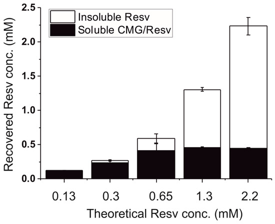 Solubility of resveratrol in aqueous CM-glucan (CMG) solutions using several resveratrol concentrations (0.13, 0.3, 0.65, 1.3 or 2.2 mM) and 1 mg/mL CM-glucan in water. Samples were sonicated for 15 min at 25 °C and then vortexed and centrifuged at 16,000× g, for 15 min at 25 °C. The absorbance of the supernatant was measured at 306 nm. The insoluble fraction was recovered and total resveratrol amount was measured.