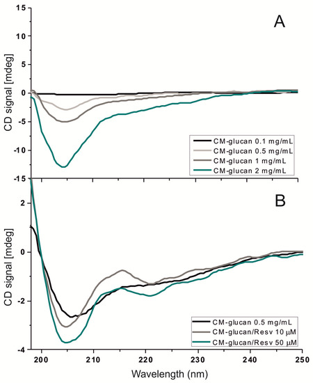 (A) Circular Dichroism (CD) spectra of CM-glucan at several concentrations (0.1–2 mg/mL) in water; and (B) CD spectra of CM-glucan in the presence of increasing resveratrol concentrations (10–50 µM). Analyses were performed at 25 °C and scanned from 196 to 250 nm.