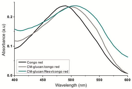 Congo Red binding assay. Congo Red UV-Visible spectroscopy (UV-Vis)absorbance was checked from 400 to 600 nm at 25 °C. Black line represents the control of Congo Red alone (10 µM); the grey line corresponds to the mixture of CM-glucan/Congo Red (1 mg/mL and 10 µM, respectively); the green line represents the complex CM-glucan/Resv in the presence of Congo Red (1 mg/mL, 200 µM, and 10 µM, respectively).