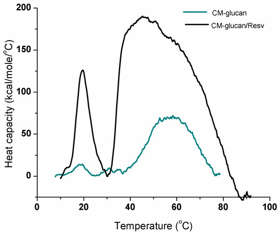 Differential Scanning Calorimetry (DSC) curves of 0.1 mg/mL CM-glucan in aqueous solution in the presence or absence of 200 µM resveratrol. First transition at 19 °C corresponds to water associated triple-stranded helical chain of the polymer and the second broad peak between 40 and 80 °C is referred to intra- and intermolecular hydrogen bonds involving the “water-free” state of the polymer.