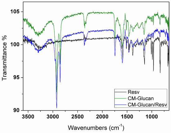 Infrared spectra of dried resveratrol (black line), CM-glucan (green line) and their complex (blue line). Analyses were performed at 25 °C from 3600 to 700 cm−1.